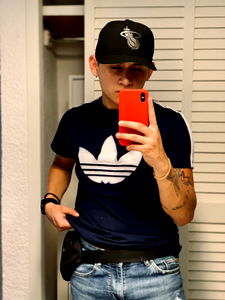 A young adult male model with tattoos from CDMX. He is posing for a photo in his outfit and showing off his phone.