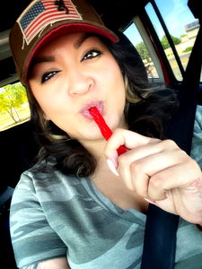 In this image, Ana is the main subject. She is wearing a camouflage shirt and hat, and she has her tongue out while holding a lollipop. The background suggests she might be in Arizona, based on the visible landmarks or architectural style of the building. The photo captures a casual, fun moment, showcasing Ana's vibrant personality.