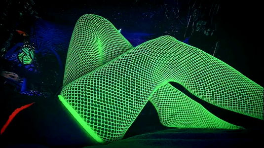 An OnlyFans model, Ana Goldendoodle, is caught in a lively club environment, surrounded by vibrant neon paint splatters. She's donning a glow-in-the-dark ensemble, creating an energetic atmosphere.