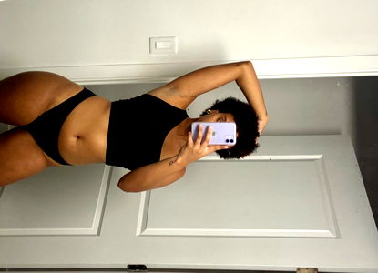Anais, with her unique pose and style, captures attention in this image. Her confidence and allure are evident as she holds up her phone. Born and raised in Florida, Anaรฏs brings a distinct flair to the modeling world.