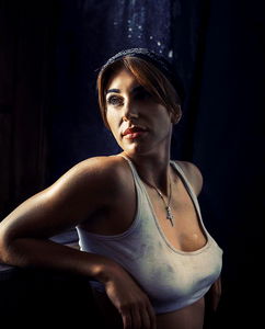 A mysterious and alluring woman, Anaรญs Dark, is captured in the midst of a photo shoot set in an intriguing underground studio. Dressed in a stylish black tank top, she holds onto a large camera, adding to the sense of mystery surrounding her. The dim lighting casts dramatic shadows, accentuating her intense expression and the suspenseful atmosphere.