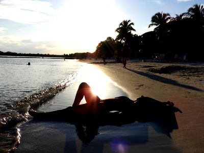 Ana Kendall, a renowned model, stands on a sandy beach at dusk, silhouetted against the radiant sunset. Her figure contrasts beautifully with the soft blue waters of the ocean, which stretch out to meet the sky in the distance.