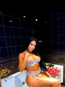 The photograph is of a young woman, approximately in her mid-twenties, posing indoors against a plain wall. She has a captivating face, her features radiating confidence and allure. She is the focal point of the image, her body captured from the waist up, taking up a significant portion of the frame. Her attire is strikingly intimate, she is wearing a brassiere, which is a piece of undergarment clothing. This, combined with her pose, suggests she may be a lingerie model. The brassiere beautifully contours her body, accentuating her abdomen and navel area. The bare skin of her stomach and the soft curve of her waist transitions into her thighs which are partially visible at the bottom of the frame. The woman, a lady of distinct elegance and poise, exudes an air of sophistication and femininity. Her attire and the setting suggest that this could be a professional shoot for a clothing brand, specifically focusing on lingerie. The image overall is glamorous, intimate and evocative โ a tasteful depiction of the female form.