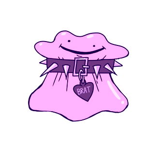 An illustrated purple cartoon character with a belt, resembling a 'bathtub' or similar object, and holding a small black heart. It has spiky hair, a big smile, and appears to be in a happy or playful mood.