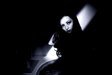 AnnaBella is a seductive model, exuding confidence in this moody, black-and-white photo. Her striking eyes and strong features are accentuated by the contrast of light and shadow. She's seated at a vanity table, adding an air of sophistication to her persona.