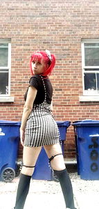 OnlyFans model Anastasia is captured in a striking pose, showcasing her fashion-forward style. She exudes confidence and energy in this urban setting. Her outfit and unique choice of background create an engaging visual narrative.