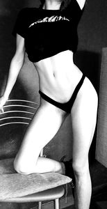A confident and striking model on a black background. She's posed with hands on hips, wearing a black crop top. Her attire, body language, and expression suggest she's comfortable in front of the camera.