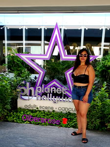 Model Anatural from Chicago is seen capturing her look in the hotel room mirror. She is dressed in a unique yellow outfit that adds a vibrant touch to the overall setting. The photo showcases her confidence and style, with her body language reflecting the fun-filled atmosphere of the location.