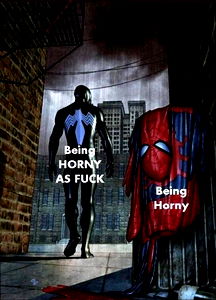 This is a digitally enhanced image of the comic book character Spider-Man by artist Angelo Blu. The art showcases the iconic Marvel superhero in a city alley, with the tagline 'Being horny as f**k' superimposed over it. The artwork captures the essence of the character while infusing it with a sense of humor and modernity.