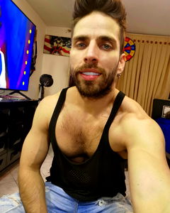 A young man with short hair and a beard is making a playful pucker-lip pose while wearing a black tank top. He has tattoos on his arms and is seated in an indoor setting, possibly a restaurant or cafe.