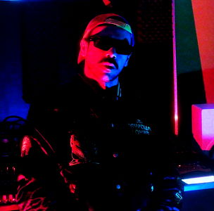 A professional DJ with a dark and mysterious vibe, donning sunglasses and a leather jacket. The DJ is positioned in front of a colorful background that adds to the atmosphere. An intriguing figure in the world of music and entertainment.