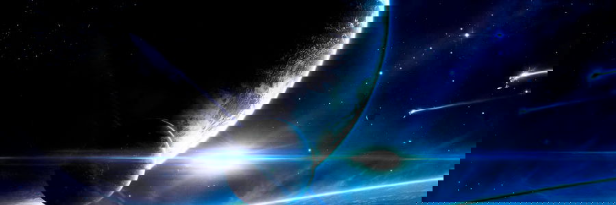 An artistic depiction of an astronaut on a mission through the galaxy, with the Earth in the distance and nebulous formations around.