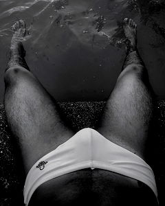 Anderson Lozano, a male model from Santiago, is seen taking a moment to relax on the edge of a pool. He is captured shirtless and wearing swim trunks, enjoying his downtime by the poolside.