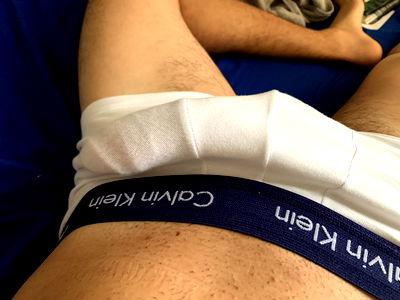 A close-up image of an OnlyFans model, presumably a male, wearing underwear with the brand 'Hanes' visible. The model is lying on a bed with a book and a remote control nearby.