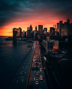 Experience the vibrant energy of New York City as dusk settles in. The photo captures the essence of urban life with its dynamic traffic and iconic landmarks like the Brooklyn Bridge.