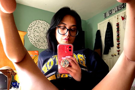 This is a vibrant, indoor image focusing on a young woman who appears to be in her early twenties. She's captured in a moment of joy, her face illuminating the scene with a radiant smile. Her shoulders are casually exposed, adding a touch of relaxed fashion to the overall image. Her hair, dark and long, is styled in a layered look that accentuates her facial features. The black strands offer a striking contrast to her fair skin tone. Her eyes, highlighted by the faint shimmer of her iris, seem to hold a story. They are engaging and inviting, creating a connection with the viewer. The background is a plain wall, which works perfectly to draw attention to the woman. It seems like she is in the middle of a photo shoot or perhaps, she's taking a spontaneous selfie. A hint of gloss on her lips and a simple fashion accessory around her neck add to her chic and modern style. The image exudes an air of youthful exuberance and vitality, capturing the essence of the woman beautifully.