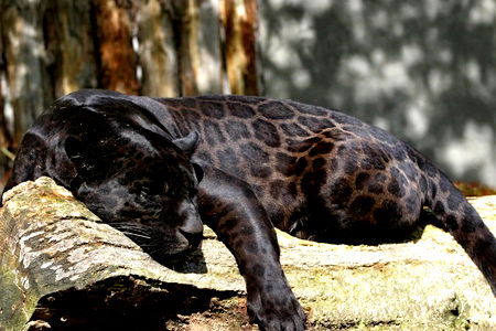 The image captures a majestic black panther, with its powerful build and distinctive spotted coat, sitting on a log in a natural setting. This big cat's intense gaze is striking, showcasing its strength and alertness.