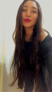 A photograph of a person with long hair, wearing sunglasses and standing in front of a wall. The individual is dressed casually, wearing a white top. The image seems to be taken indoors and has a casual, candid feel.