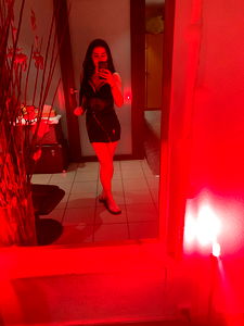 In the heart of a red-lit room, Andreea Maria exudes confidence and style. Dressed in her favorite outfit, she stands poised with a smile that radiates warmth. The room's vibrant atmosphere adds an element of intrigue to the scene.
