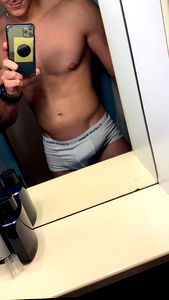 A fit model showcasing his physique in a bathroom mirror. His abs are defined, and he's posing for the camera. Candid behind-the-scenes glimpse of a professional photoshoot.