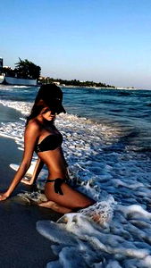 Diablita, the Nueva York model, is seen in a black bikini on a beach. She's posing for a photo, sitting on a towel with one hand on her head and the other on her hip.