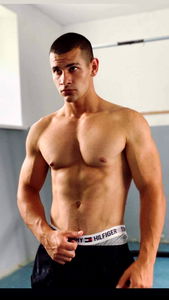 An adult male model posing in a OnlyFans style photoshoot, showcasing his physique and the popular app's branding. Slovakian hunk Andrew Hurajt.