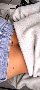 This image captures a stylish female model wearing a cropped tank top and blue denim shorts. Her midriff is exposed, revealing a tattoo on her torso. The model's pose and the context suggest that she might be from Onlyfans or similar platforms where personal style and body art are prominently displayed.