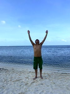 In this heartwarming photo, Josรฉ and Andrรฉs Hernรกndez are captured in a moment of triumph on the beach. Both young men are shirtless and elated, with arms raised high in a universal gesture of celebration. Their joy is palpable as they share this special moment together.
