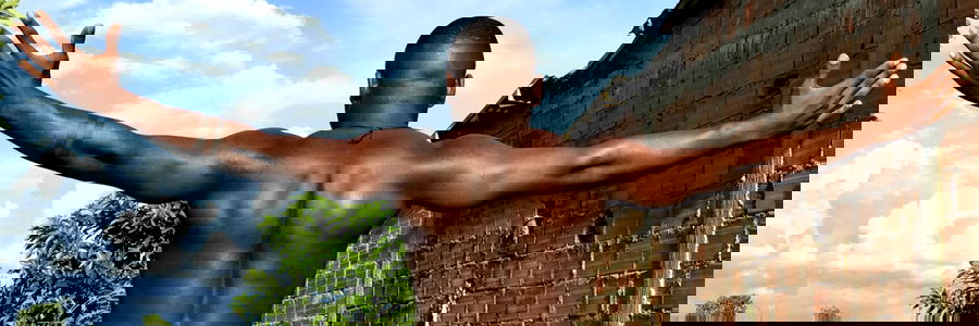 A powerful and confident portrait of a model in the midst of an outdoor shoot. The person is captured mid-pose with their arms outstretched, showcasing strength and charisma. The background suggests a tropical setting. Age: 28 years.