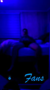 An image of a model standing in his room, holding a phone. The room has blue lighting and a bed with a white comforter.