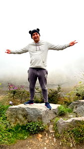 This is a dynamic image of an athlete in motion on a rocky mountain top. The individual appears to be engaging in a sport that requires agility and strength, such as rock climbing or trail running. The person is captured mid-action, which adds a sense of movement and energy to the scene.