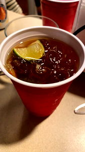 Mario A is a refreshing beverage, perfect for a relaxing afternoon or a casual gathering. This iced tea with lemon and a hint of sweetness is served in a red solo cup, ready to quench your thirst. The ice cubes floating atop the drink add to its inviting appeal. Don't miss out on this delightful beverage!