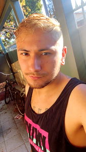 A young adult male with blonde hair and tattoos. He is posing for a selfie in front of a building. Andres is from Chile and appears to be taking his fitness routine seriously.