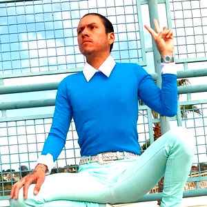 In this image, Andressandress19 is captured mid-pose on an urban structure, radiating positivity through their energetic expression and confident stance. Dressed in a vibrant blue outfit and sporting a watch on their left wrist, they embody the essence of youthful spirit and self-expression. The cityscape behind them adds a touch of urban chic to the scene.
