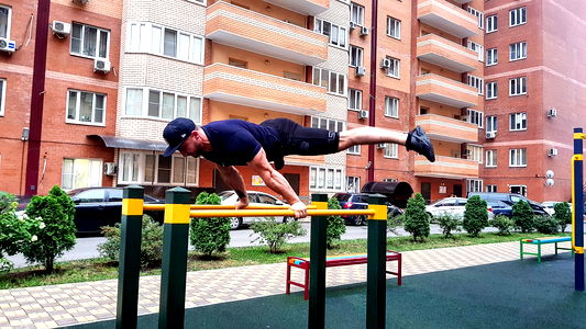 An energetic man in motion, balancing on a bar at the park. A snapshot of his active lifestyle.