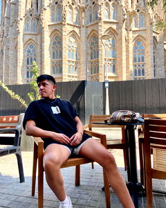 Andrew Luciano, from Mansfield, TX, is enjoying some leisure time at an outdoor cafe near the famous La Sagrada Familia cathedral in Barcelona. He's casually dressed, taking a break on the patio furniture with a drink at his side. The ambiance of the scene suggests a warm and sunny day. The cathedral can be seen in the background, adding to the charm and beauty of this urban setting.