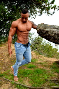 A muscular fitness model from Spain showcasing his physique on a hike.