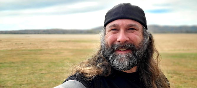The bearded man is seen posing shirtless, showcasing his tattoos. He has a beard and mustache, adding to his rugged appearance. His attire consists of shorts, allowing the tattoos on his arms to be fully visible.