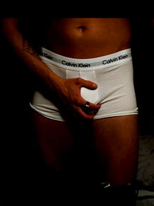 This image features a male OnlyFans model named Andrews from Vancouver, captured mid-promotion of his branded underwear collection. He is wearing white cotton undies, which appear to be the product he is promoting. The background suggests an indoor setting, possibly a home or studio, with a window and some personal items visible.
