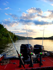 This image captures a professional angler, Andrew Z from Pittsburgh, showcasing his skills. He is seen sitting on the shore of a lake, holding his fishing gear, and posing for the camera with a smile.