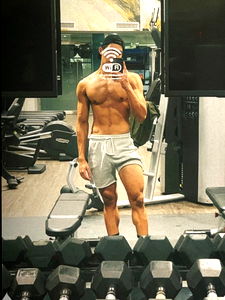 Fit Andrew Tan from Toronto showcases his toned physique in a casual gym setting. In this photo, he's captured mid-workout with an intense look of dedication to his fitness routine.