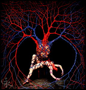 This image showcases a striking and provocative piece of art. The central figure is a humanoid figure with red and blue lines, possibly representing veins or energy streams, creating an intricate network that merges into the form of a human. The figure's pose suggests a dynamic movement or emotion. In the background, there is another humanoid figure, adding to the depth and complexity of the piece. The overall composition is rich in symbolism, and it appears to be set in a dungeon-like environment, which may add an element of mystery and allure to the artwork. This could be an ideal image for those interested in fantasy or looking for inspiration in erotic art.