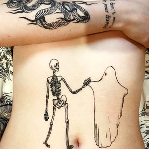 Black and white tattoo of a skeleton holding a ghost on a white sheet. This is a temporary tattoo placed on a person's torso, adding a unique twist to body art. The model appears confident in showcasing this creative design.