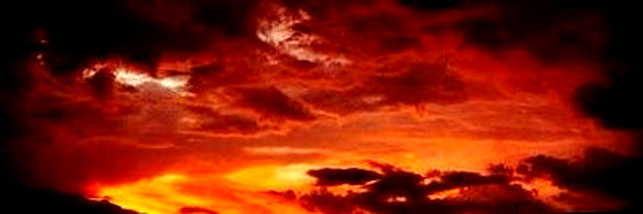 A dramatic sunset with a foreboding atmosphere, featuring the silhouette of a mountain or cliff. The color palette is dominated by shades of red and orange, suggesting either a fiery landscape or perhaps an ominous sky.