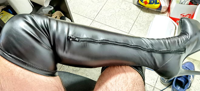 This image depicts a model, Andy Crossdresser, from Brasov wearing a distinctive pair of black leather thigh-high boots. The model is seated and appears to be presenting the footwear. The setting seems to be indoors, possibly a room for modeling or photography purposes. The overall style of the image suggests it could be related to fashion, specifically lingerie or fetish wear.