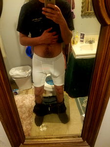 A candid photo of OnlyFans model AndyK standing in a bathroom, wearing white underwear and a shirt. The image captures an intimate moment, featuring a slight smile on his face. He is holding a phone in his hand, possibly preparing to take a selfie or video.