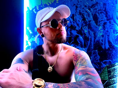 Promotional image for AndyFM, an adult content creator on OnlyFans. The model is standing in front of a vibrant backdrop, dressed casually and wearing sunglasses, showcasing his tattoos and unique style. He has a playful expression and is looking directly at the camera.