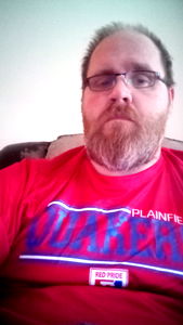 A middle-aged man with a beard, sitting in front of his red and white shirt. He is looking directly at the camera, giving off a relaxed yet focused vibe.