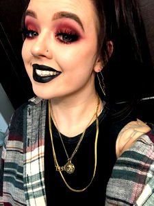 In the image, Andy Lynne is seen posing casually against a dark background. They are dressed in a mix of casual attire and accessories. The makeup they're wearing adds a dramatic flair to their overall look.