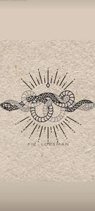 A tattoo-style illustration of a snake with an eye within it, set against a textured background. The image is monochromatic, featuring black and white inks on a parchment-like texture. A small, intricate design at the bottom right corner resembles a compass rose or sun dial.